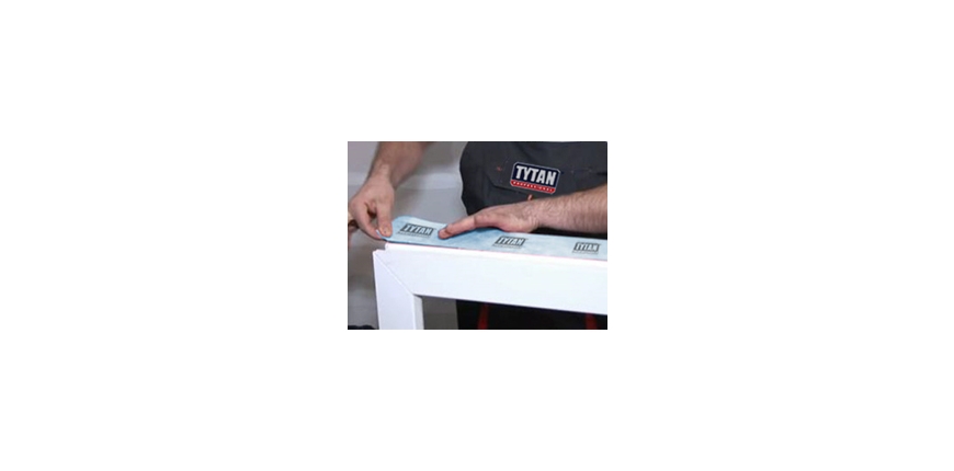 8) Przyklejenie Taśmy Okiennej Zewnętrznej Tytan Professional do zagruntowanego muru.